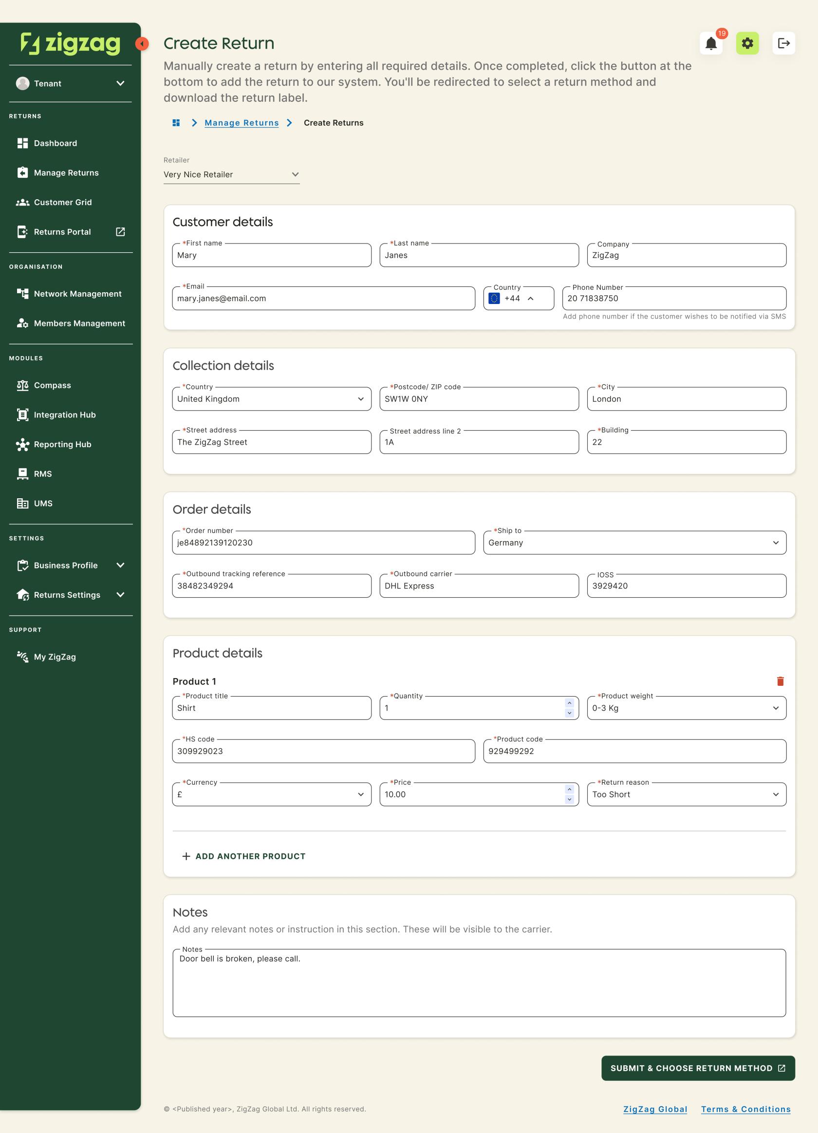 Mandatory fields from cross-border returns will become optional if the return is domestic - Select Carrier: Once the form is all filled out, click the submit button. The available options are: